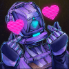 Description: A portrait of the character Ticker from Warframe. She is holding up her hands and making the two-fingered heart gesture with both.